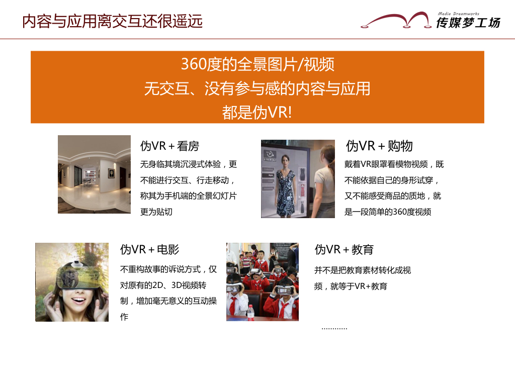 如上面所言的,現(xiàn)階段的VR在電商、房產(chǎn)、教育、電影上的應(yīng)用,有些只是360的全景視頻,有些則還不能有效解決圖像顯示的真實(shí)性問(wèn)題,有效解決運(yùn)動(dòng)眩暈問(wèn)題,離真正的VR技術(shù)還相差甚遠(yuǎn)。