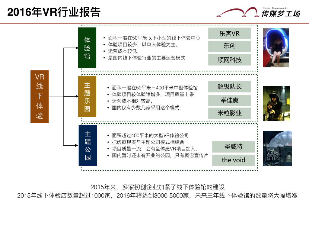 VR主題公司:利用VR等科技升級(jí)主題公園,在虛擬空間延伸現(xiàn)有IP價(jià)值,增加主題公園體驗(yàn)內(nèi)容,旨在打造全新線下體驗(yàn)。國(guó)內(nèi)外著名的主題娛樂(lè)公園,如迪士尼、宋城等,也在紛紛進(jìn)行VR布局。