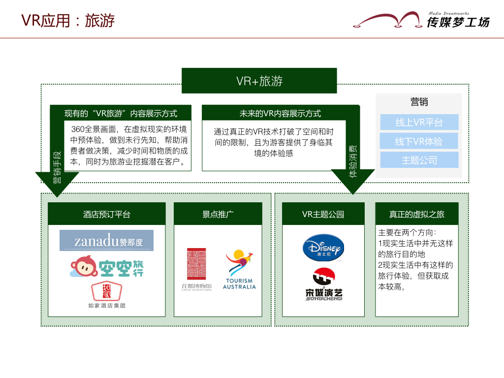 酒店的預(yù)定:在中國(guó)首屈一指的高端精品旅行預(yù)訂網(wǎng)站贊那度為例,人們可以帶上VR眼鏡觀看數(shù)條贊那度制作的VR影片,如臨其境地感受某家酒店,幫助進(jìn)行旅行消費(fèi)的決策。