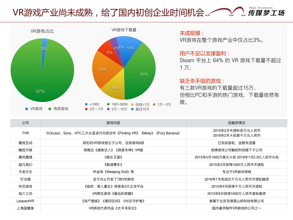 缺乏殺手級(jí)的游戲:有三款VR游戲下載量超過(guò)了15萬(wàn),但是還沒出現(xiàn)過(guò)一款風(fēng)靡全球的VR游戲。就像當(dāng)年《憤怒的小鳥》給手游帶來(lái)的影響一樣,VR游戲業(yè)正期待一款殺手級(jí)游戲的出現(xiàn)。