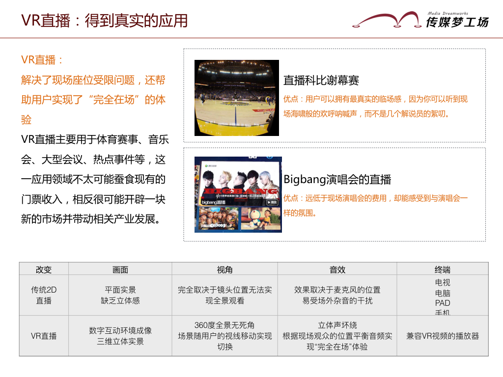 未來(lái)VR直播主要用于體育賽事、音樂(lè)會(huì)、大型會(huì)議、熱點(diǎn)事件等,這一應(yīng)用領(lǐng)域不太可能蠶食現(xiàn)有的門票收入,相反很可能開辟一塊新的市場(chǎng)并帶動(dòng)相關(guān)產(chǎn)業(yè)發(fā)展。