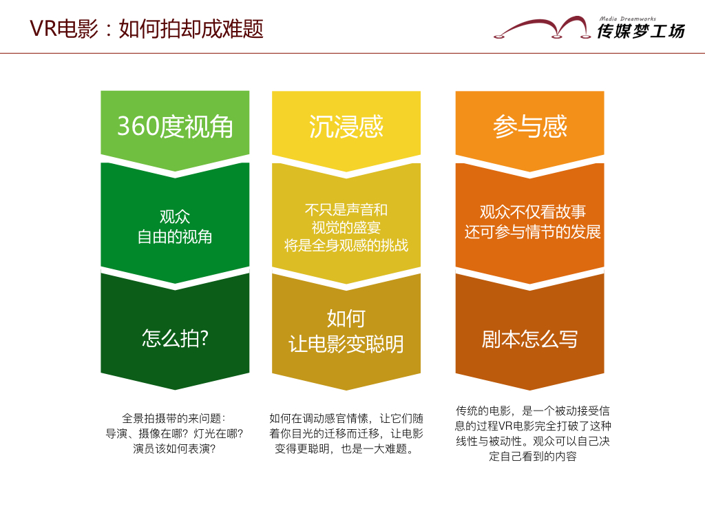 但目前的VR電影,普遍只在10來(lái)分鐘時(shí)長(zhǎng),故事情節(jié)簡(jiǎn)單、觀眾也不能真正地和場(chǎng)景互動(dòng),試探性意味更大。主要也是因?yàn)閂R技術(shù)在給電影帶來(lái)更多想象空間的同時(shí),也帶來(lái)了“VR電影如何拍”的難題。