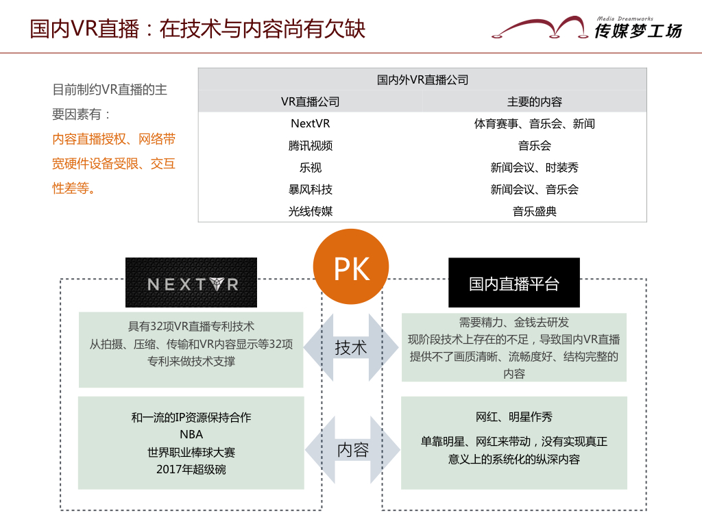 技術(shù)上:NextVR,從拍攝、壓縮、傳輸和VR內(nèi)容顯示等32項(xiàng)VR直播專利技術(shù)來(lái)做技術(shù)支撐;國(guó)內(nèi)的VR直播,由于現(xiàn)階段技術(shù)上存在的不足,導(dǎo)致國(guó)內(nèi)VR直播提供不了畫質(zhì)清晰、流暢度好、結(jié)構(gòu)完整的內(nèi)容。