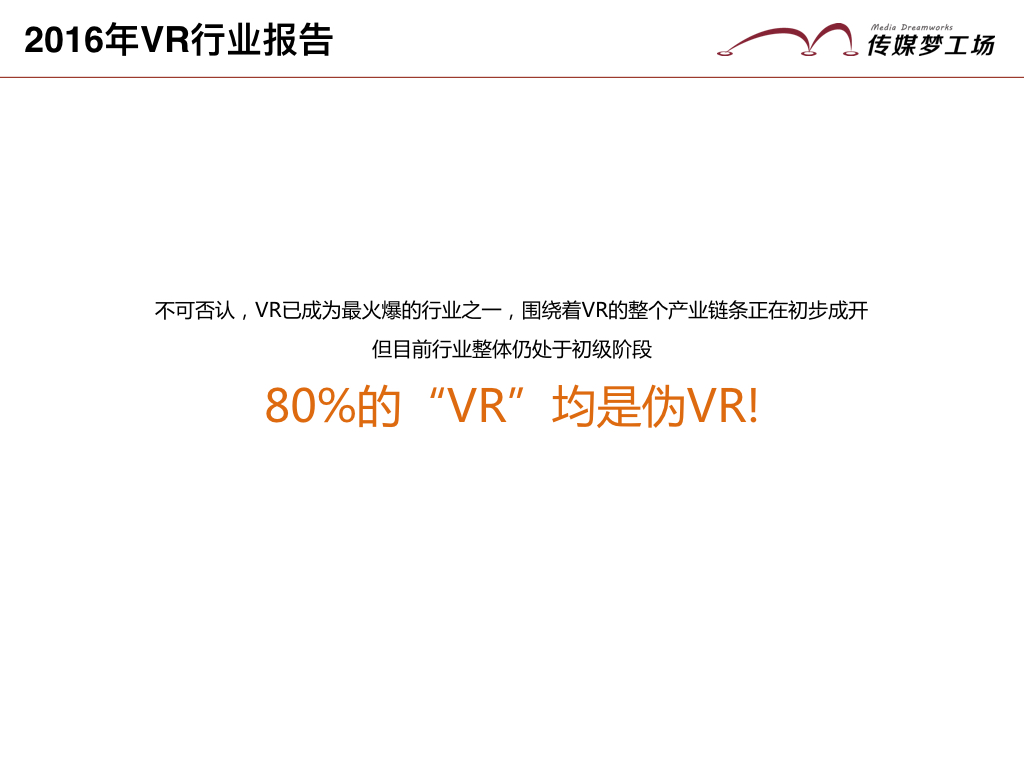 近日,在2016中國(guó)VR生態(tài)峰會(huì)現(xiàn)場(chǎng),傳媒夢(mèng)工場(chǎng)CEO蔣純博士發(fā)布了《2016中國(guó)VR行業(yè)報(bào)告》,從VR行業(yè)的現(xiàn)狀、硬件、內(nèi)容應(yīng)用、VR渠道、發(fā)展瓶頸五個(gè)方面揭露了國(guó)內(nèi)VR產(chǎn)業(yè)的真實(shí)情況。