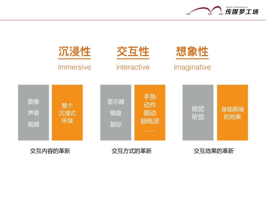 VR以其“沉浸性、交互性、想象性”三大特質(zhì),最終帶來(lái)了“交互內(nèi)容的革新、交互方式的革新、交互效果的革新”。