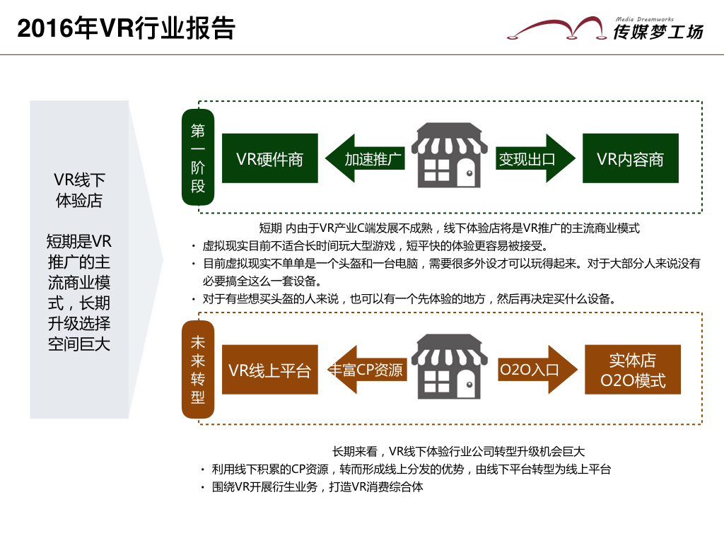 短期內(nèi)由于VR產(chǎn)業(yè)C端發(fā)展不成熟,線下體驗(yàn)店將是VR推廣的主流商業(yè)模式。