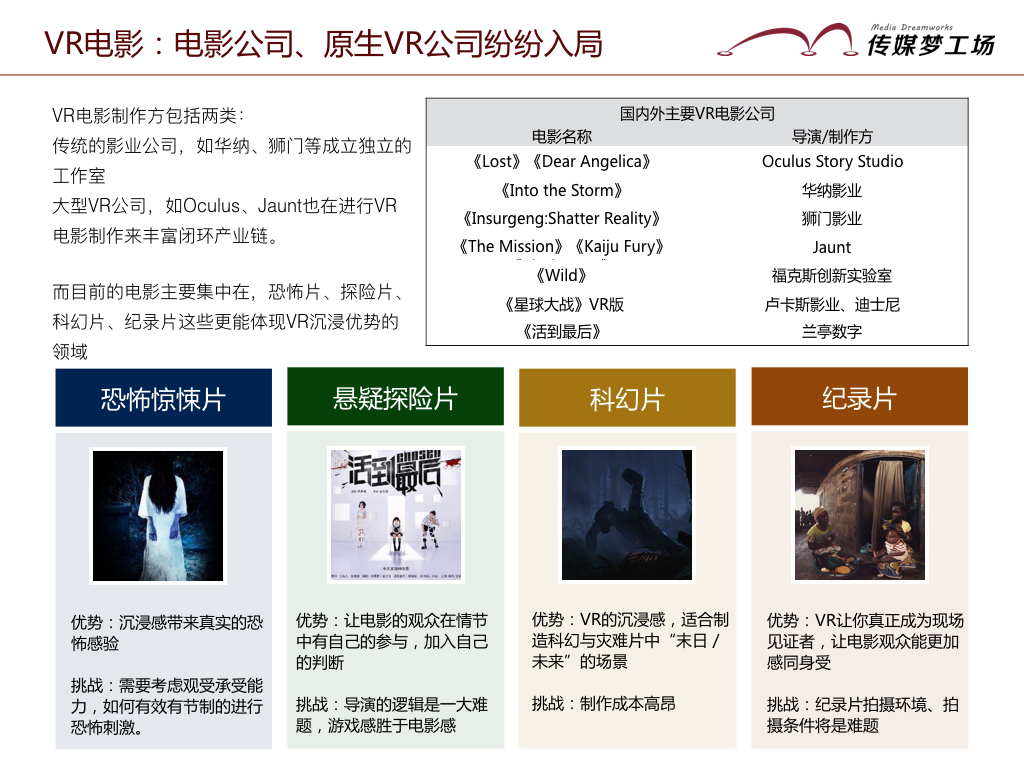 目前電影制作方主要包括兩類:傳統(tǒng)的影業(yè)公司,如華納、獅門等成立獨(dú)立的工作室,另一類則是原生的VR公司,如Oculus、Jaunt也在進(jìn)行VR電影制作來(lái)豐富閉環(huán)VR產(chǎn)業(yè)鏈。而目前電影主要集中在,恐怖片、探險(xiǎn)片、科幻片、紀(jì)錄片這些更能體現(xiàn)VR沉浸優(yōu)勢(shì)的領(lǐng)域。