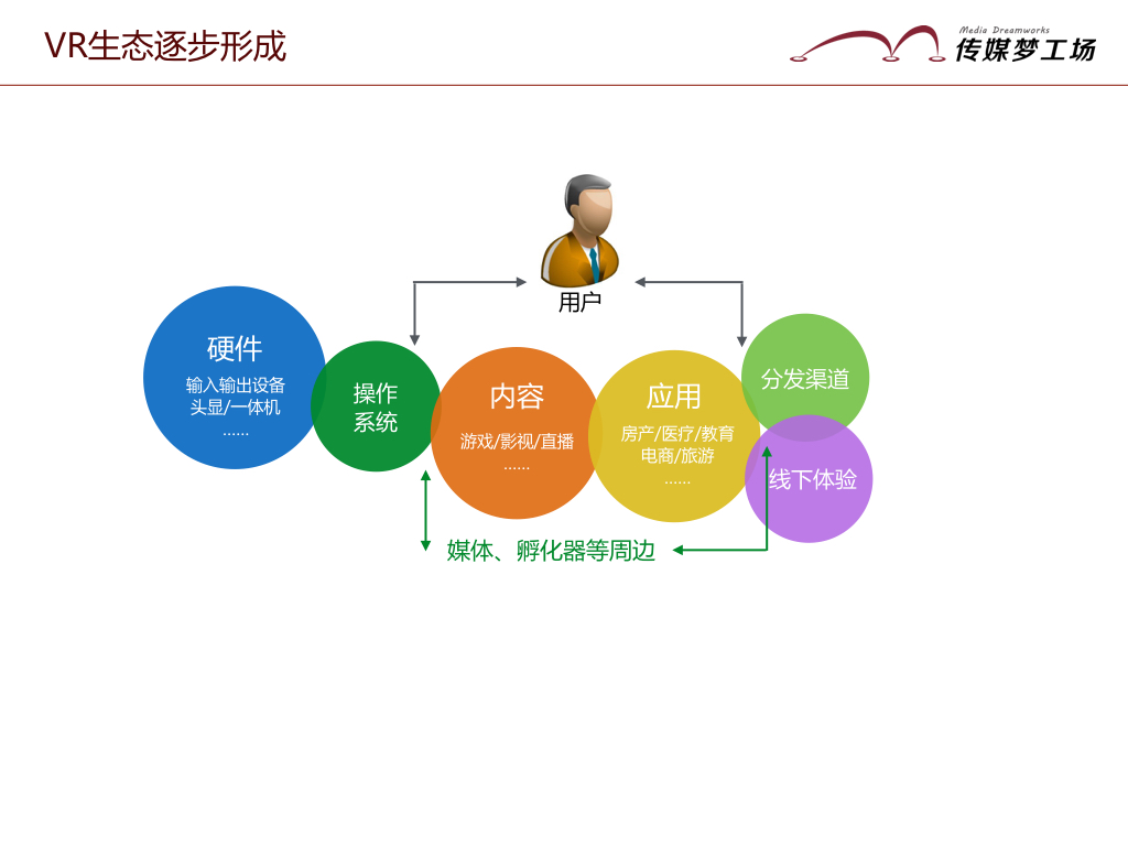 VR行業(yè)圍繞著用戶,可分為硬件、操作系統(tǒng)(軟件平臺(tái))、內(nèi)容、行業(yè)應(yīng)用服務(wù)、線上分發(fā)線下體驗(yàn)等五大領(lǐng)域,同時(shí)還發(fā)展出了行業(yè)的媒體、創(chuàng)業(yè)孵化等周邊產(chǎn)業(yè)。