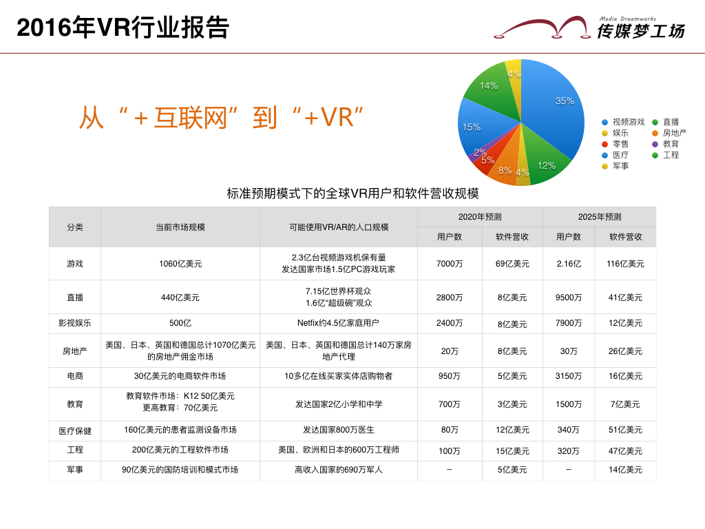 據(jù)高盛分析師總結(jié)(基于標(biāo)準(zhǔn)預(yù)期),至2025年,軟件市場(chǎng)總體營(yíng)收將達(dá)到350億美元,其中超過(guò)60%的營(yíng)收來(lái)源于消費(fèi)者。從目前被廣為熟悉的“+互聯(lián)網(wǎng)”模式,轉(zhuǎn)變成“+VR”模式。